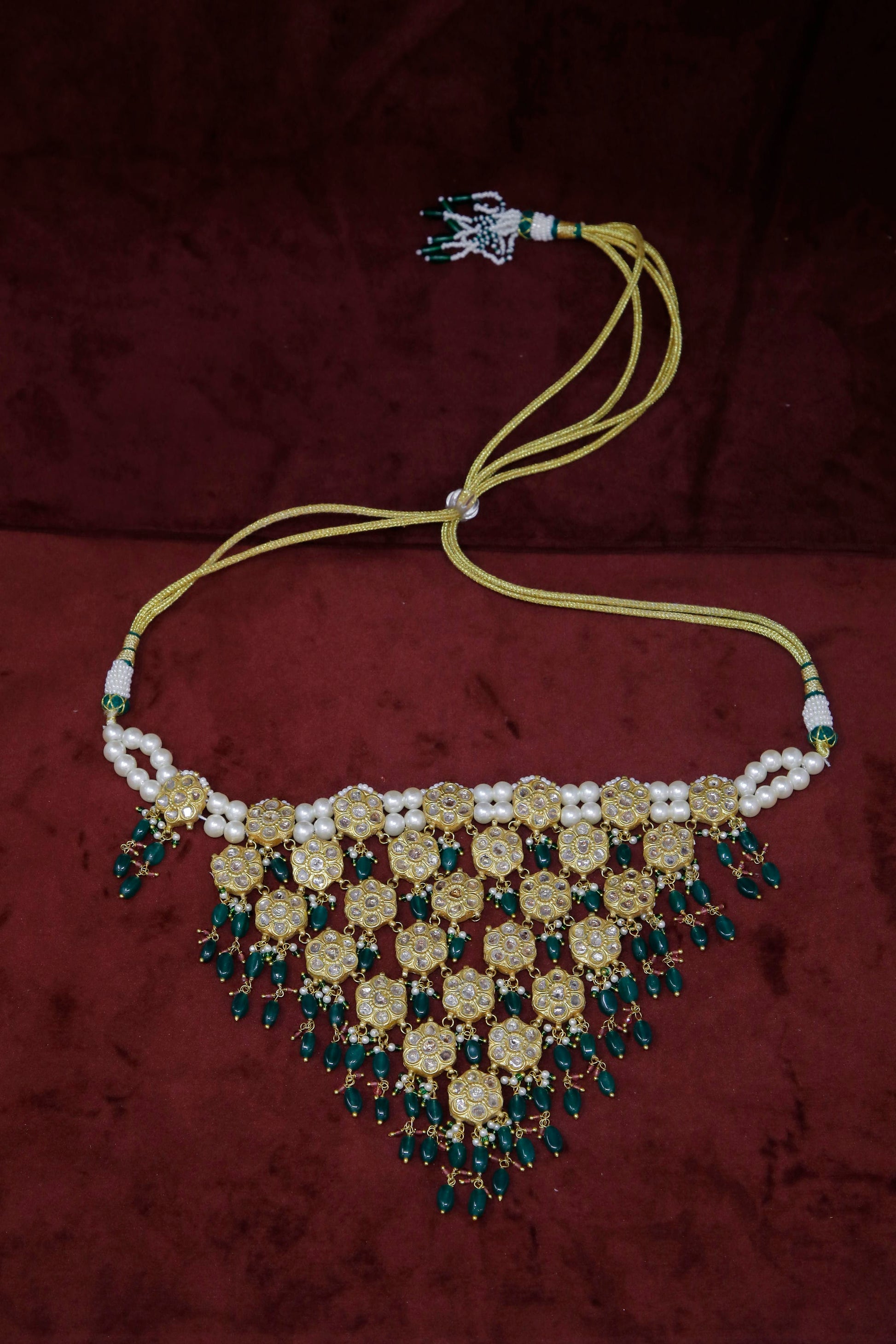 This luxurious necklace is crafted from 22K solid gold and features genuine diamond polki, vibrant color stones, and lustrous pearls, weighing 83.67 grams. Each detail is meticulously designed to create a statement piece that exudes elegance and sophistication. Perfect for weddings, festive occasions, or special events, it enhances any traditional outfit with its regal charm. Comfortable to wear yet striking in appearance, this necklace is a timeless accessory and a thoughtful gift, symbolizing beauty, wealth, and lasting elegance.