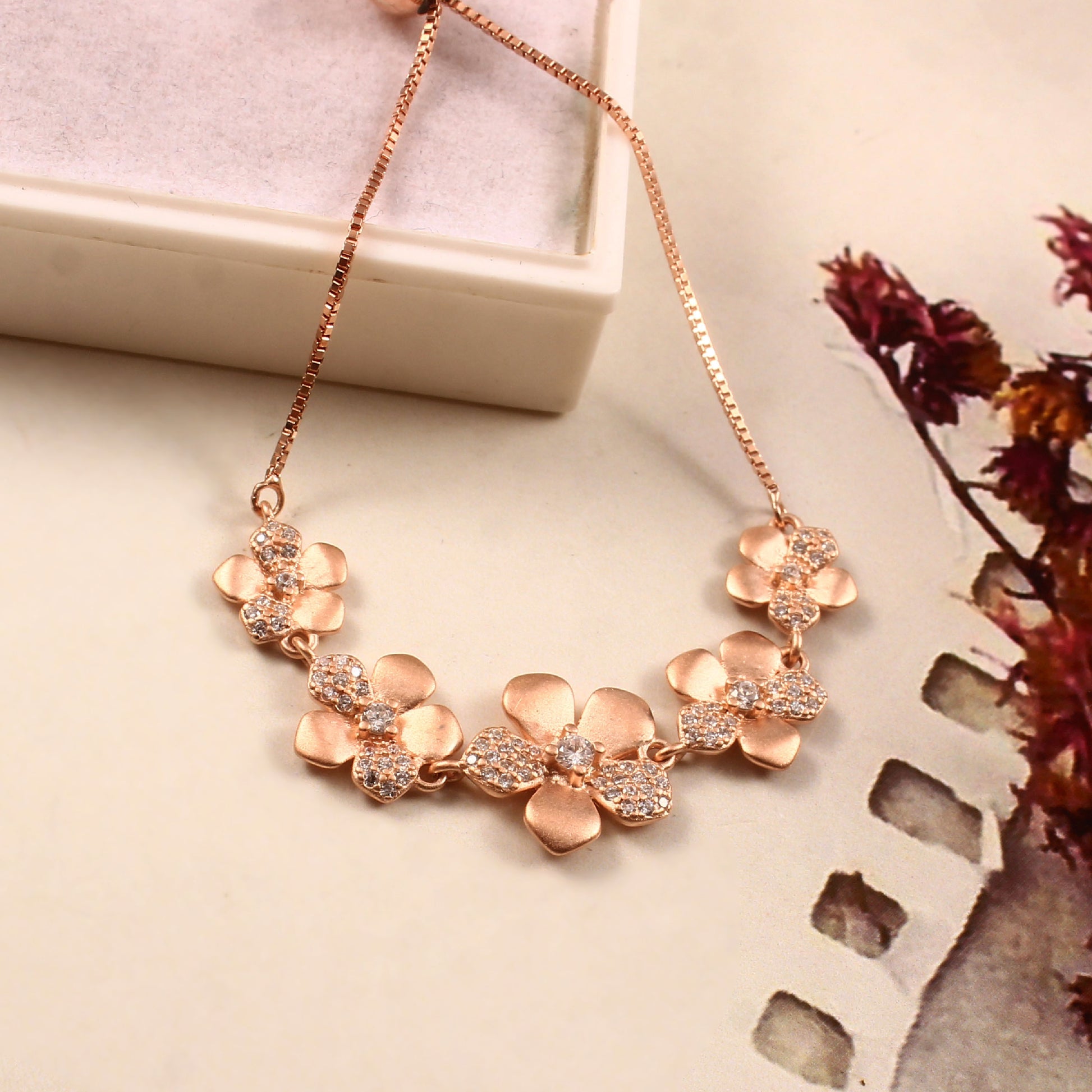 This charming women’s bracelet is crafted from premium 925 sterling silver and plated in a delicate rose-gold finish, weighing 4.82 grams for a light, comfortable feel. Adorned with sparkling CZ zircon stones in a graceful flower design, it exudes femininity and elegance. Perfect for daily wear or special occasions, the bracelet adds a subtle touch of sparkle to any outfit. Its timeless floral motif and polished finish make it a versatile accessory, ideal for women who love delicate, stylish, and sophisticated jewelry.