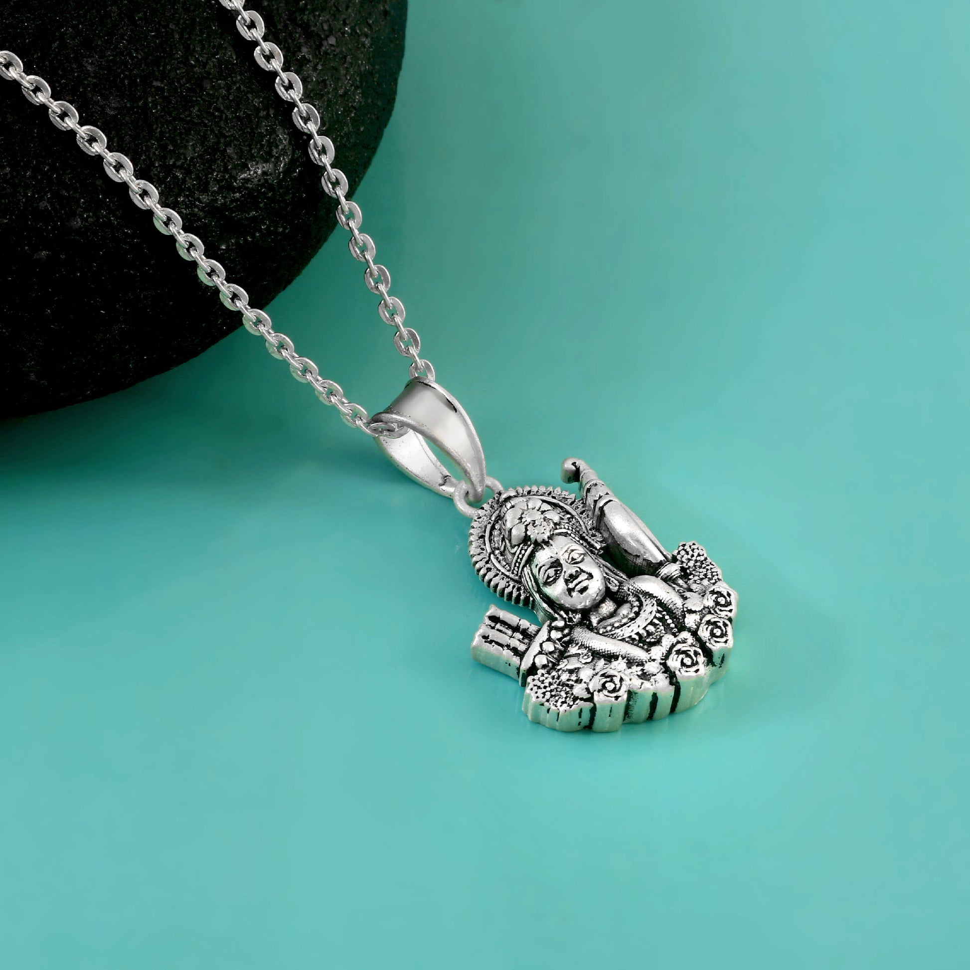 This beautifully detailed Lord Ram pendant necklace is crafted from premium 925 sterling silver with an oxidized finish, giving it a traditional and timeless appeal. The pendant features Lord Ram’s serene form, symbolizing righteousness, courage, and devotion. Lightweight yet durable, it is perfect for daily wear and pairs effortlessly with both ethnic and casual outfits. Ideal as a spiritual accessory or a meaningful gift, this necklace blends divine symbolism with elegant craftsmanship, making it a cherished addition to any jewellery collection.